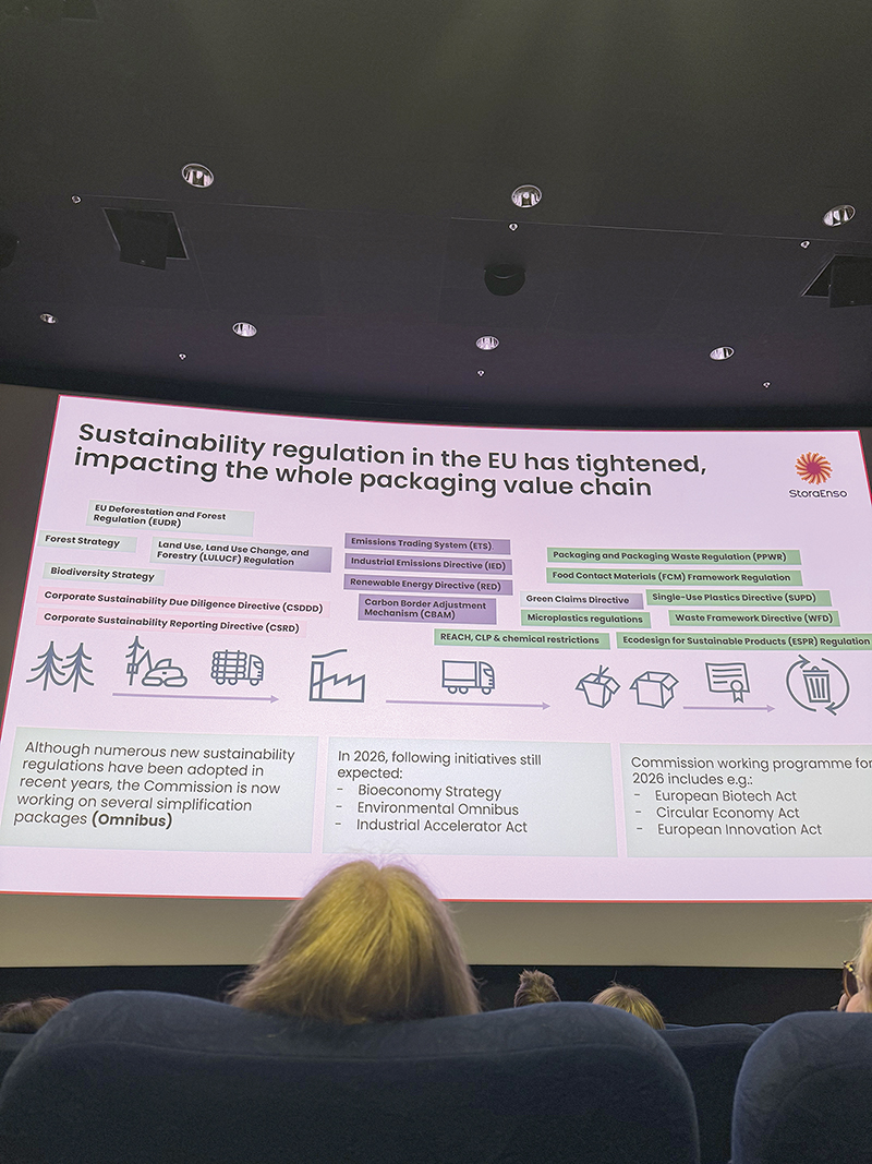 EU:n kestävyyssääntely on tiukentunut, ja tämä vaikuttaa pakkausten koko arvoketjuun. Stora Ensolta EU:n lainsäädännön päivityksiä esitteli Vilma Koskenlainen PackSummit-tapahtumassa viime marraskuussa.